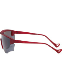 Shield-style semi-rimless acrylic-frame sunglasses in red. · Mirrored gray lens with D+ lens technology · 100% UVA/UVB protection · Anti-reflective and shatterproof · Integrated rubber nose pads · Logo printed at face and temples · Exposed titanium core wires · Eyewear chain compatible rubber temple tips · Includes Ultrasuede® pouch · Size: 125 Supplier color: Ruby/D+ onyx mirror Acrylic, titanium. Made in Japan 251920M134013