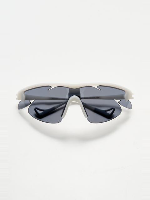 Sunglasses from District Vision x ROA. Made in Japan with a lightweight 22g beta titanium frame for durability and comfort. Rimless six-base blade design enhances field of vision and airflow. Features custom-anodized hardware, hypoallergenic rubber nose pads and temple tips. Engineered for high-performance environments with a fully customizable fit. Details Grey and titanium frame with copper tinted and mirrored glasses. Made in Japan.ART. NO: DVG012-ROA Size & fit Measures..