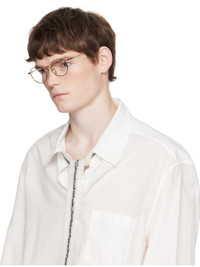 Handcrafted round titanium-frame optical glasses. · Graphic pattern engraved throughout · Adjustable titanium nose pads · Inset logo at temple tip · Includes case · Size: 49.21 144 Supplier color: White gold/Black Titanium. Made in Japan 252789M133003