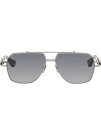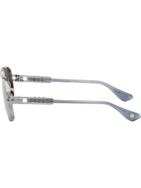 Handcrafted aviator-style titanium-frame sunglasses in gunmetal tone. · Anti-reflective gray lenses · 100% UVA/UVB protection · Logo etched at lens · Adjustable titanium nose pads · Top bar · Transparent blue acetate temples · Inset logo hardware at temple tip · Exposed core wires · Includes case · Size: 61.14 155 Supplier color: Antique silver/Night sky Titanium, acetate. Made in Japan 252789M134010