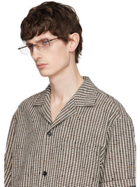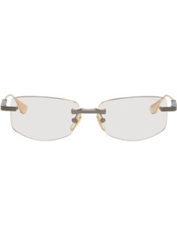 Rectangular and rimless titanium-frame optical glasses in gunmetal tone. · Handcrafted · Adjustable silicone nose pads · Fluted detailing at temples · Gold-tone temple tips · Inset logo hardware at single tip · Includes case · Size: 56.15 143 Supplier color: Black iron Titanium. Made in Japan 252789M133001