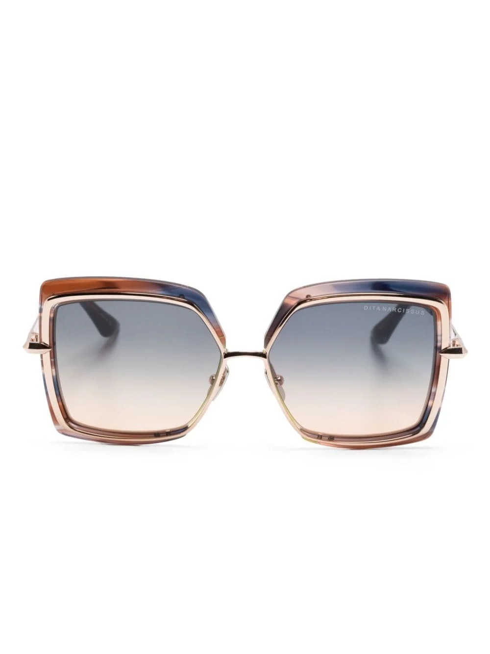 Narcissus oversized-frame sunglasses Highlights - Light pink/gold-tone/navy blue - Oversize frame - Gradient lenses - Abstract pattern print - Nose pads - Straight arms - Curved tips - These glasses come with a protective case. Imported Composition Acetate 50%, Titanium 50% SIZE & FIT Measurement Arm Length 5.7 in(14.5 cm) Bridge Width 0.55 in(1.4 cm) Lens Diameter 2.28 in(5.8 cm) Total Width 5.9 in(15 cm)