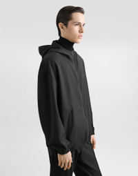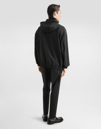 The Italian Holiday Men's Collection revisits 1950s style with a blend of relaxed fits and modern flair. Classic white shirts and tailored suits in refined fabrics contrast with casual denim and playful T-shirts featuring retro graphics with a futuristic twist. Bold prints—chessboards, cats, elegant lighters, and Mediterranean blue ribbons—alongside logo jacquard inspired by ties, infuse a contemporary edge into the essence of Italian holidays. Hooded woolen jacket with tonal Dolce&Gabbana logo tag: • Black • Loose fit • Long sleeves • Zipper fastening • Stretch waistband and cuffs • Front welt pockets and two inner pockets • TRAVEL label • Lined • The piece measures 69 cm from the rear collar seam on a size IT 48 • Made in Italy External composition: 55% Wool 41% Polyester 4% Spandex Internal composition: 95% Viscose 5% Spandex