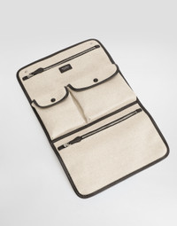The Atene necessaire combines elegance and functionality and it's made with a refined mix of fabrics and careful details for the modern man. Atene necessaire in salt&pepper fabric and Calfskin: • White • Leather handles • Snap buttons closure • Antique palladium electroplating • External and internal customization with stamp with film • Interior zip pockets and snap button pockets • Item equipped with a logo bag and a pre-assembled box • Measurements: H24 x W32 x D6 cm • Made in Italy External Composition: 58% Cotton, 20% Calfskin, 16% Linen, 6% Polyester Internal Composition: 65% Cotton, 18% Linen, 10% Calfskin, 7% Polyester