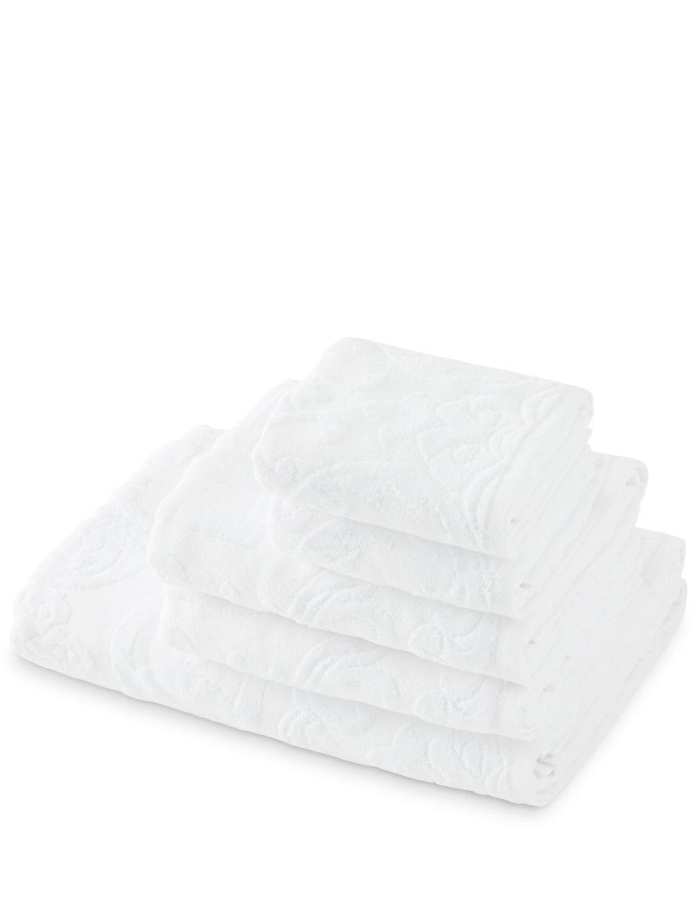 terry cotton towels (set of five) Highlights - Off-white - Cotton - Signature barocco print - Jacquard logo motif - Towelling finish - Set of five Made in Italy Composition Cotton 100% SIZE & FIT Measurement WIDTH 39.37 in(100 cm) LENGTH 59.05 in(150 cm) Washing instructions Read Manufacturer Guidelines