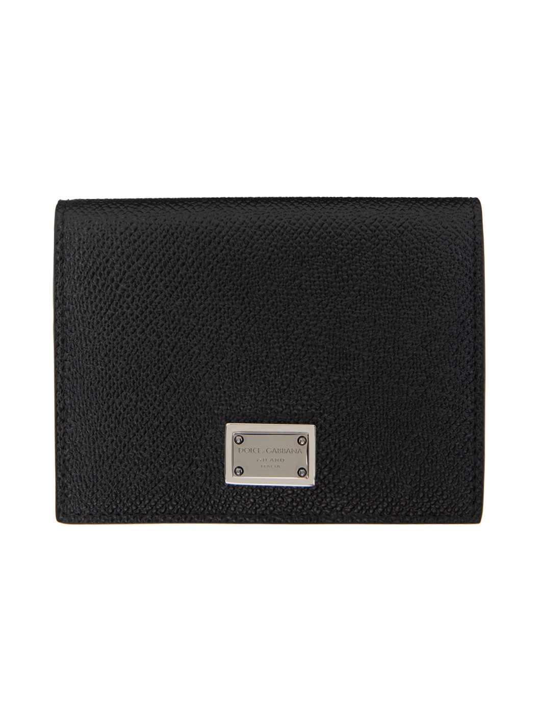 Pebble-grained calfskin bifold card holder in black. · Logo plaque at face · Press-stud closure · Two card slots · One patch pocket · Canvas lining · H3" x W4" x D0.75" Supplier color: Black