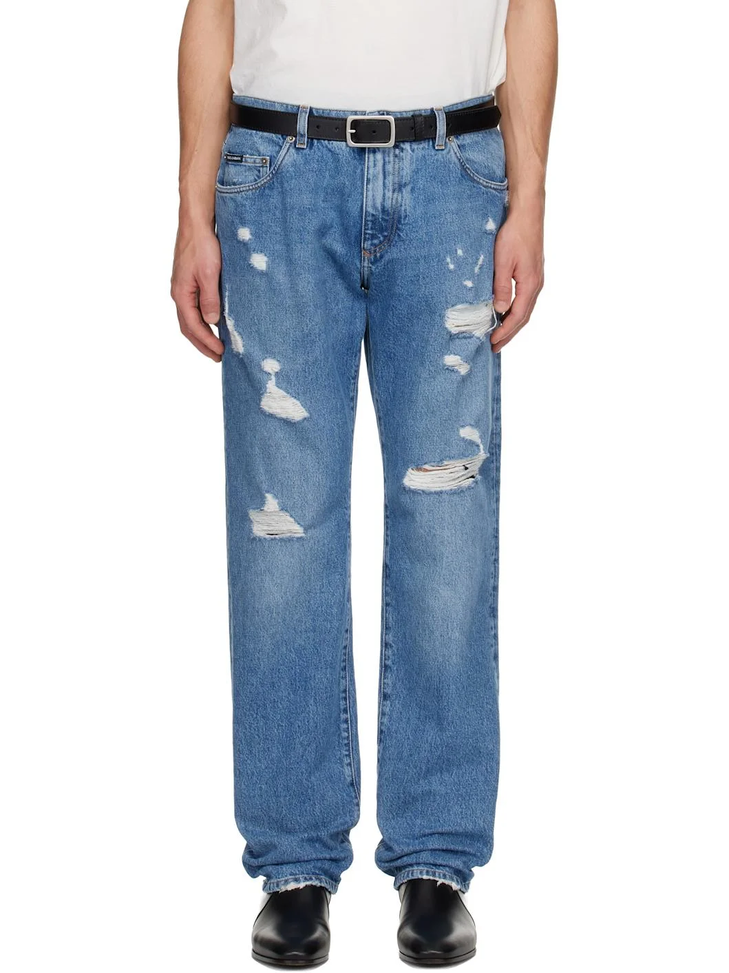Non-stretch denim jeans. · Fading, whiskering, and distressing throughout · Belt loops · Five-pocket styling · Zip fly · Logo embroidered at back pocket · Contrast stitching in tan Supplier color: Multicolor 100% cotton. Made in Italy 251003M186017