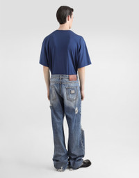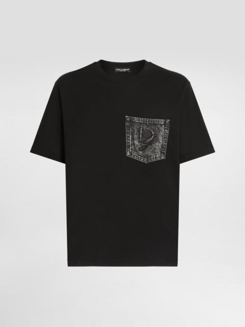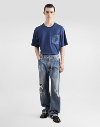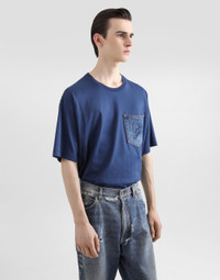 The Italian Holiday Men's Collection revisits 1950s style with a blend of relaxed fits and modern flair. Classic white shirts and tailored suits in refined fabrics contrast with casual denim and playful T-shirts featuring retro graphics with a futuristic twist. Bold prints—chessboards, cats, elegant lighters, and Mediterranean blue ribbons—alongside logo jacquard inspired by ties, infuse a contemporary edge into the essence of Italian holidays. Cotton jersey T-shirt with denim pocket and DG logo embroidery: • Blue • Regular fit • Short sleeves • The piece measures 73 cm from the shoulder seam on a size IT 48 • Made in Italy External composition: 100% Cotton
