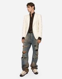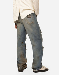 Five-pocket straight-leg jeans in blue wash denim with rips and dirty details: • Regular fit • Fly-covered zipper and button fastening • Vintage metal Dolce&Gabbana logo tag on the back • The item measures 115 cm on the outer leg and the hem is 23 cm wide on a size IT 48 • The model is 185 cm tall and wears a size IT 48 • Made in Italy Care And Details External composition: 100% Cotton