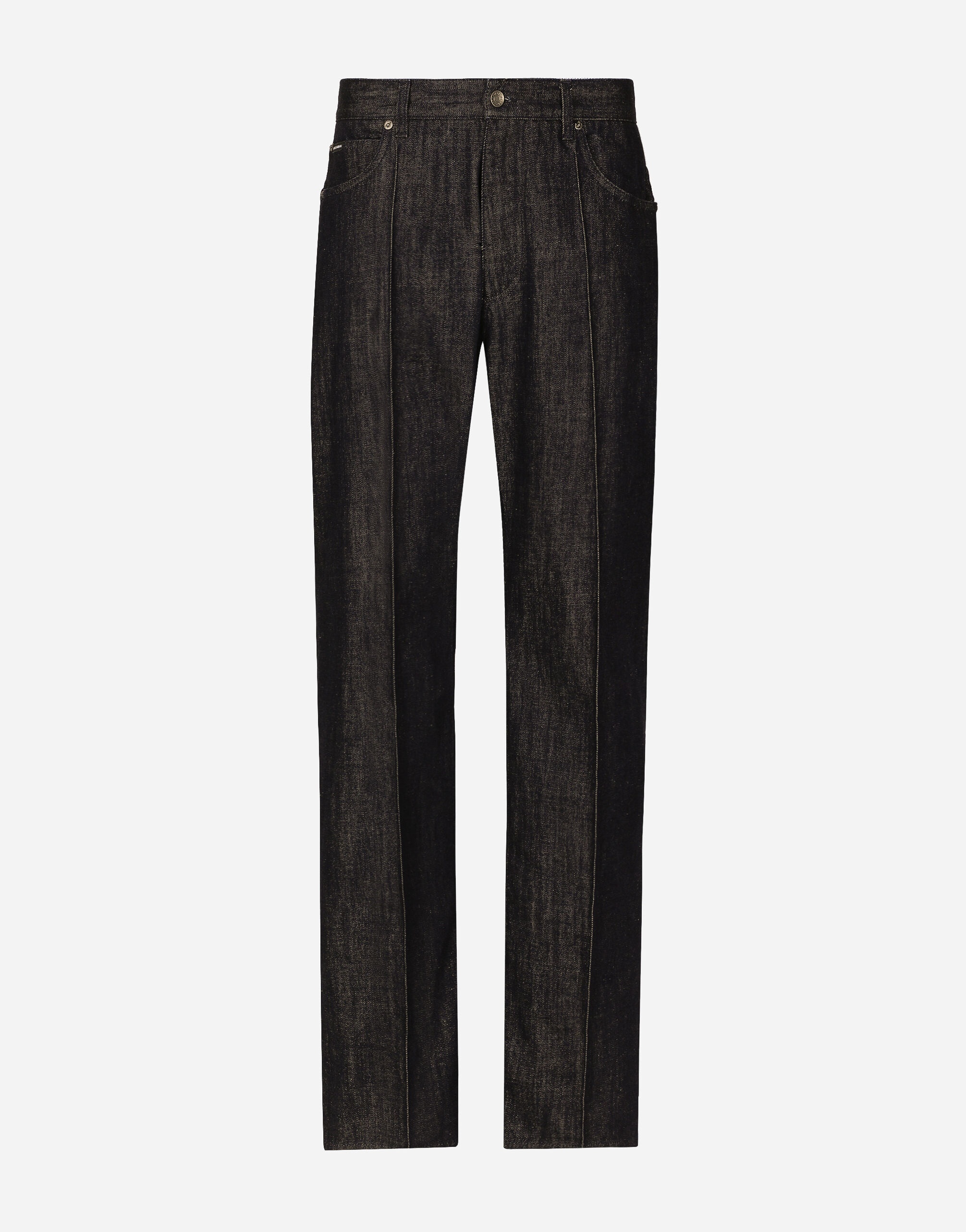 The Marina line has us dreaming of the Mediterranean sea and its myriad shades of blue, while also bringing weathered sailors to mind, yet with a contemporary edge. Aesthetic influences and clear lines, stormy sea Blue jackets, multi-pocket pieces, waterproof garments, anchor prints and materials that invite us to discover the “lighthouse keeper”. Fascinating, enigmatic and at times lonely, it tells the tale of a new masculine sensuality built with small yet precise proportions and attention to stylish detail. Oversize five-pocket wide-leg high-waisted jeans in denim: • Blue • Loose fit • Fly-covered zipper and button fastening • Metal Dolce&Gabbana logo tag on the back • The item measures 115 cm on the outer leg and the hem is 26 cm wide on a size IT 48 • Made in Italy External composition: 100% Cotton