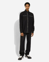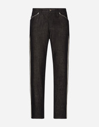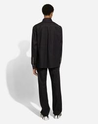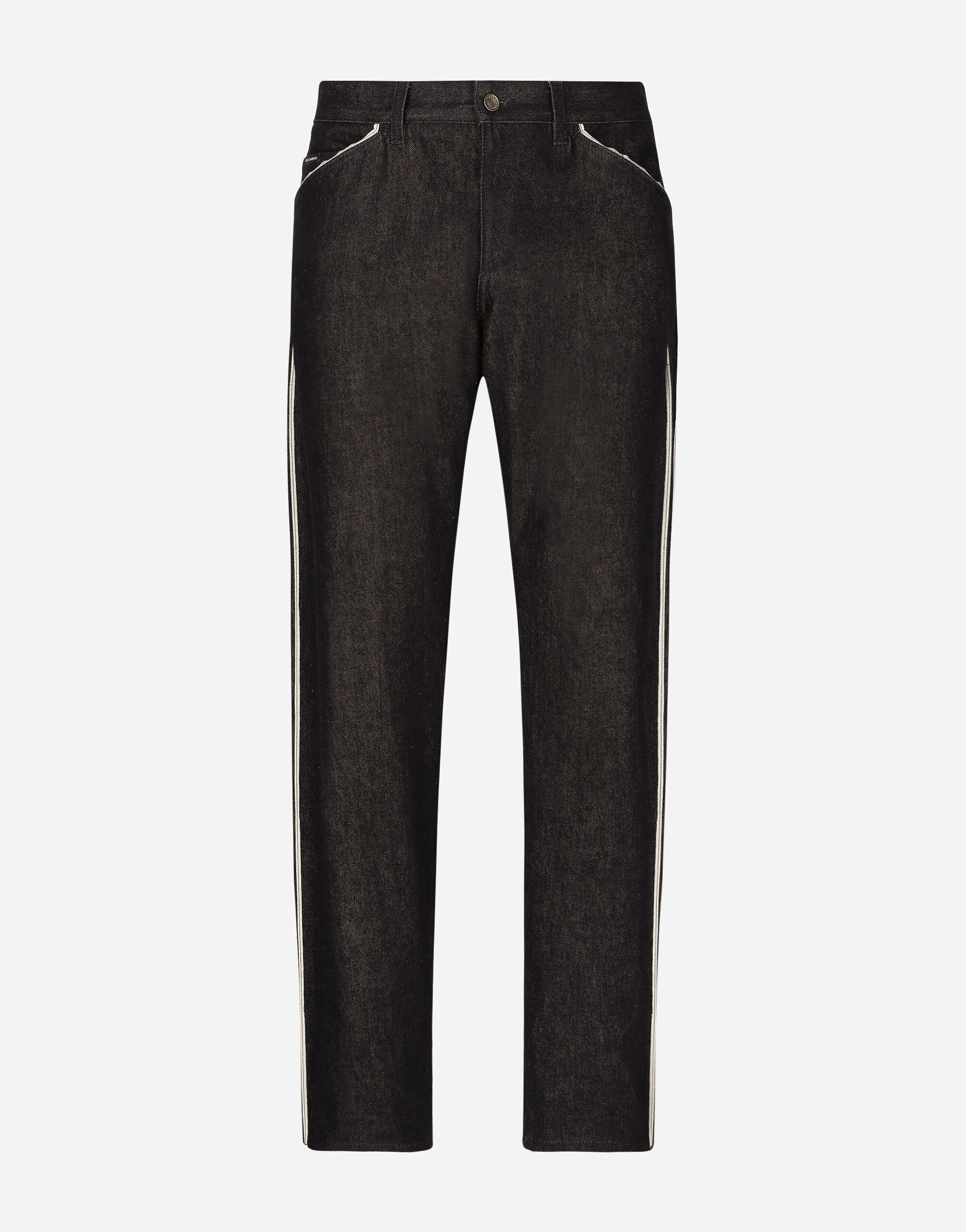 The Marina line has us dreaming of the Mediterranean sea and its myriad shades of blue, while also bringing weathered sailors to mind, yet with a contemporary edge. Aesthetic influences and clear lines, stormy sea blue jackets, multi-pocket pieces, waterproof garments, anchor prints and materials that invite us to discover the “lighthouse keeper”. Fascinating, enigmatic and at times lonely, it tells the tale of a new masculine sensuality built with small yet precise proportions and attention to stylish detail. Five-pocket selvedge denim jeans: • Blue • Classic fit • Front western-style pockets and patch back pockets with selvedge • Fly-covered zipper and button fastening • Metal Dolce&Gabbana logo tag on the back • The item measures 110 cm on the outer leg and the hem is 21 cm wide on a size IT 48 • Made in Italy External composition: 100% Cotton