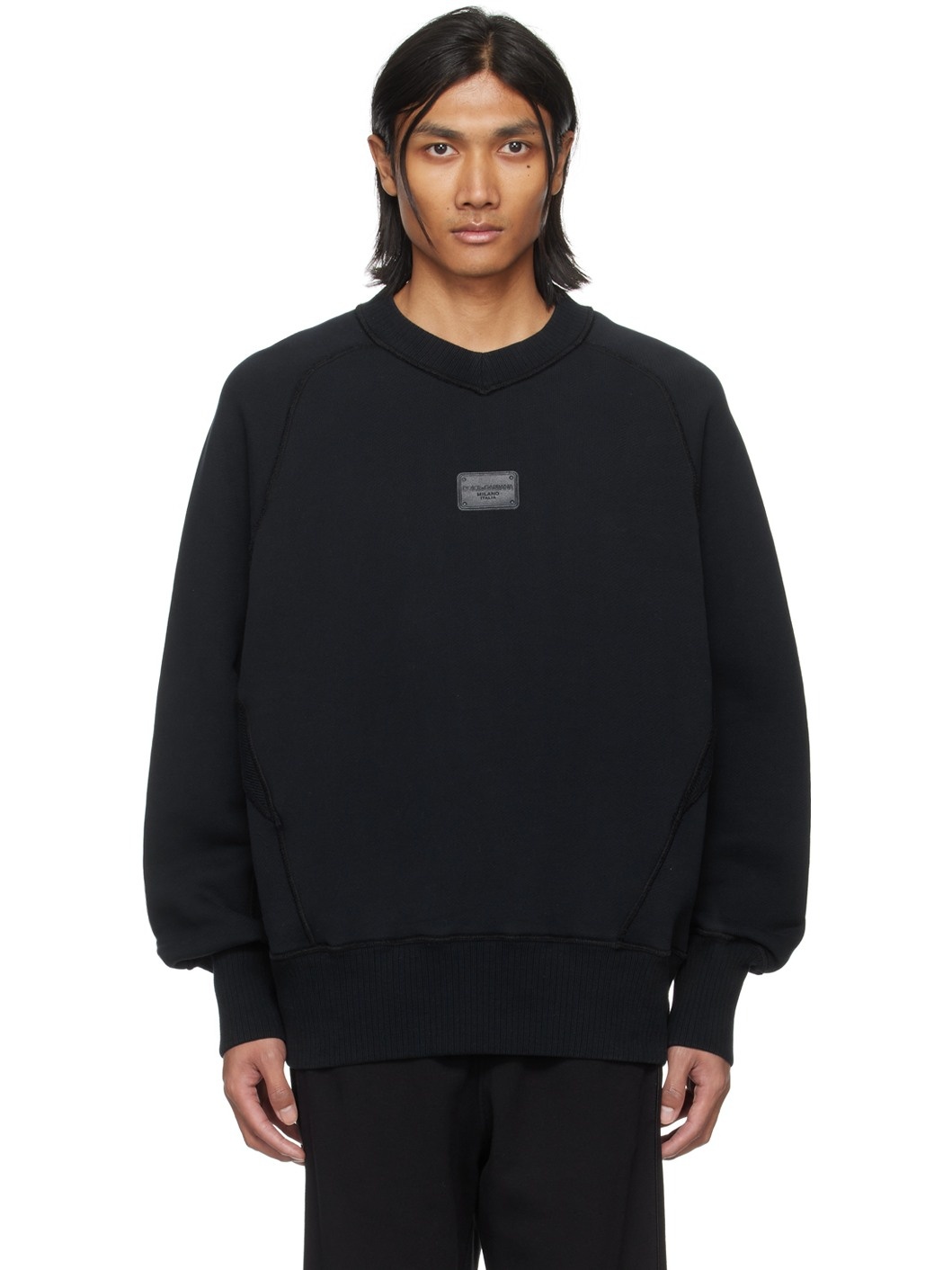 French terry sweatshirt. · Rib knit V-neck, hem, and cuffs · Rubberized logo patch at chest · Raglan sleeves Supplier color: Blu scurissimo