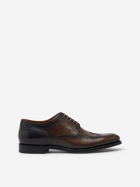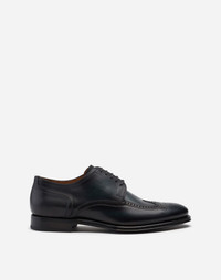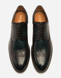 The epitome of style, the elegant and comfortable full brogue Derby from the Napoli line are made of Giotto paint calfskin with Goodyear construction. Through this process done exclusively by hand, the upper and insole are sewn simultaneously: • Giotto paint calfskin upper • Waxed laces • Leather insole with matelassé satin insert with logoed label • Leather-wrapped heel • Two-tone leather sole with heat-stamped logo and micro-injection rubber monogram • Made in Italy Care And Details External Composition: 100% Calfskin