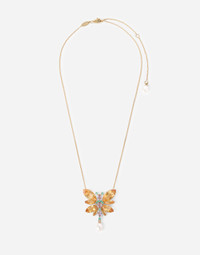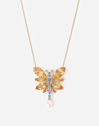 The jewel stands out for the butterfly pendant, which features wings made of citrines and a central body and antennas made of emeralds and amethysts. The gems, which harmonize together to create a wonderful color combination, are set in precious mountings with wire claws. The two ends of the pendant and the chain, both made of a hand-knotted pearl, accentuate the refined style of the creation. An oval tag bearing the DOLCE&GABBANA logo is placed before the closure. Technical features: Gold 750/000 Length: 40 + 5 + 5 cm adjustable. Gems: 8 quartz variety citrine in navette, 3 quartz variety amethyst in drop and oval, 8 round emeralds cut to brilliant, 2 freshwater drop pearls. Made in Italy. Yellow gold 750/000