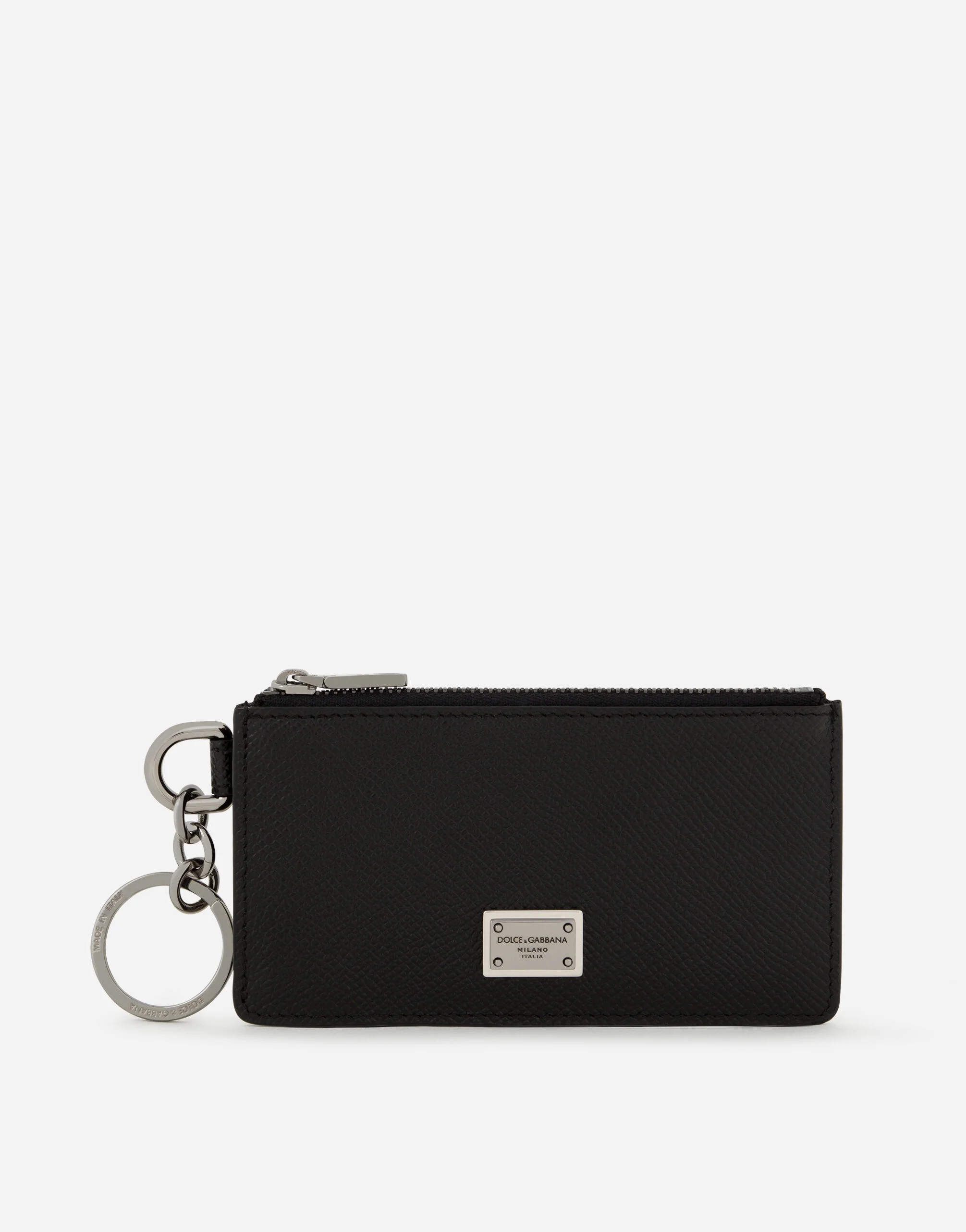 Functional and compact, this card holder comes in Dauphine calfskin. Embellished with the ruthenium-plated metal logo tag, it features a practical keychain ring. • Five card slots • Ruthenium-plated metal ring with logo • Top compartment with zipper and branded slider • Measurements: 8.3 x 17.4 x 1 cm • Made in Italy External composition: 95% Calfskin 5% Brass Internal composition: 100% Viscose