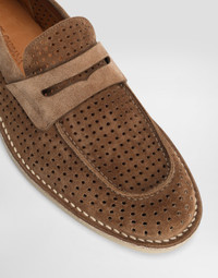 Classic and contemporary, these New Florio loafers come in soft perforated calfskin. Calfskin loafers: • Brown • Calfskin insole with branded label • Branded rubber sole • Item comes with a branded dust bag • Made in Italy External composition: 100% Calfskin Internal composition: 90% Calfskin 10% Goatskin