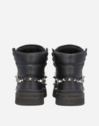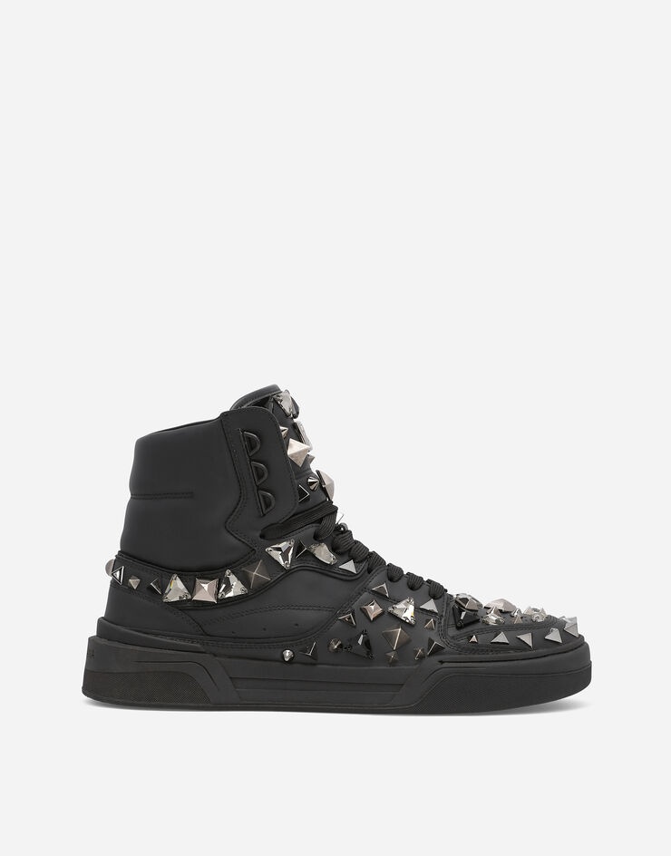 The mid-top version of the New Roma style is the result of the fusion between our iconic Roma and Miami sneakers. In this theme, it comes covered in metal studs, giving it boldness, yet keeping the dynamic, versatile feel. Made from calfskin nappa, it features the crossover DG logo on the tongue. • Calfskin nappa upper • Flat laces • Calfskin footbed with branded label • Branded rubber sole • Item comes with themed packaging • Made in Italy Care And Details External composition: 59% Polyamide 21% Calfskin 10% Viscose 10% Spandex Internal composition: 60% Polyester 30% Lambskin 10% Polyamide