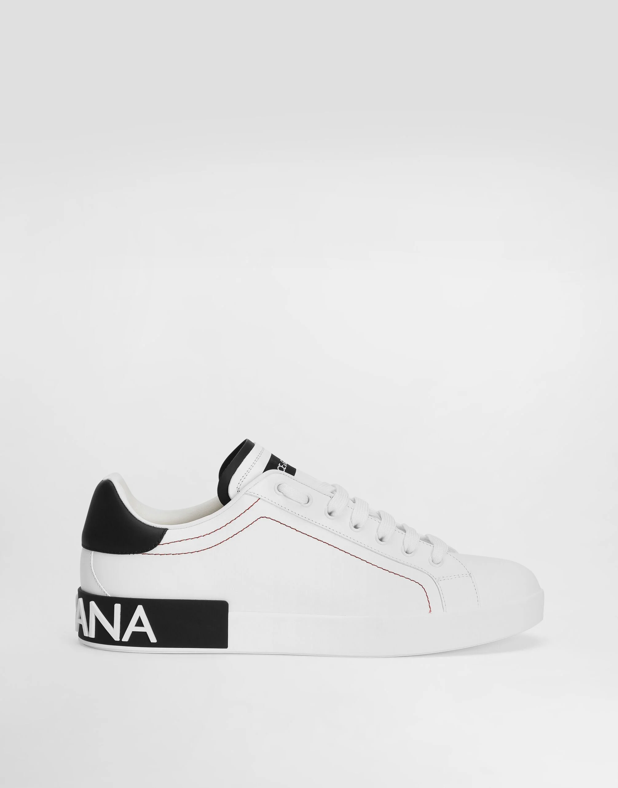 Calfskin Portofino sneakers: • White • Contrasting calfskin heel cup with rubber micro-injection logo • Flat laces • Calfskin footbed with branded label • Rubber bottom with branded spoiler • Branded rubber sole • Item comes with a branded dust bag • Made in Italy Care And Details External composition: 100% Calfskin Internal composition: 58% Lambskin 24% Polyester 10% Goatskin 8% Natural Rubber