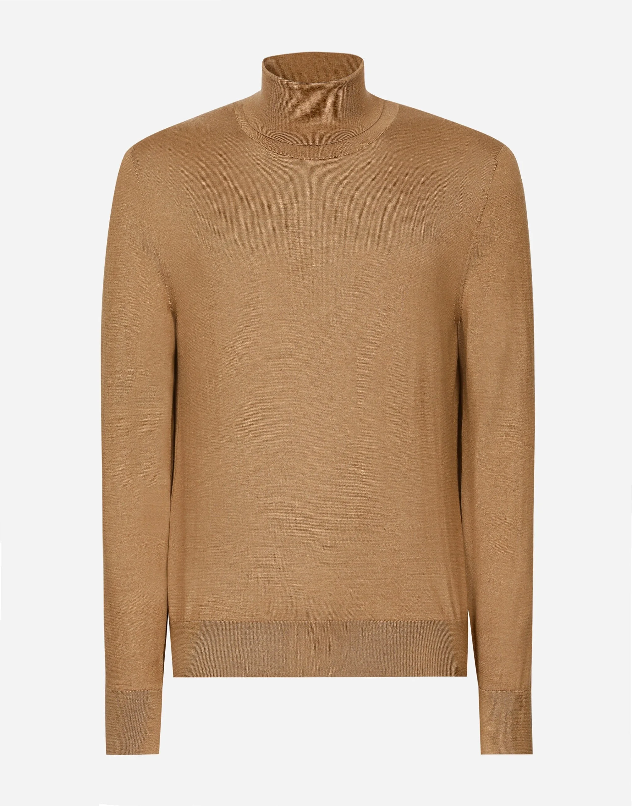 Tailoring means beauty, proportions, skilled cuts and sophisticated details. The FW 24-25 Sartoriale Collection builds on this solid foundation to define new ways of pairing colors, materials and textures. Sicilian rock gray envelops different textures, while Nero Sicilia black adorns textile and velvet weaves and camel pairs with orange. Various types of pinstripes, textured-effect cashmere, double fabrics, suede and denim meet in the looks. Cashmere and silk turtle-neck sweater: • Brown • Regular fit • Long sleeves • 18-gauge plain knit • The piece measures 68 cm from the shoulder seam on a size IT 48 • Made in Italy External composition: 70% Cashmere 30% Silk