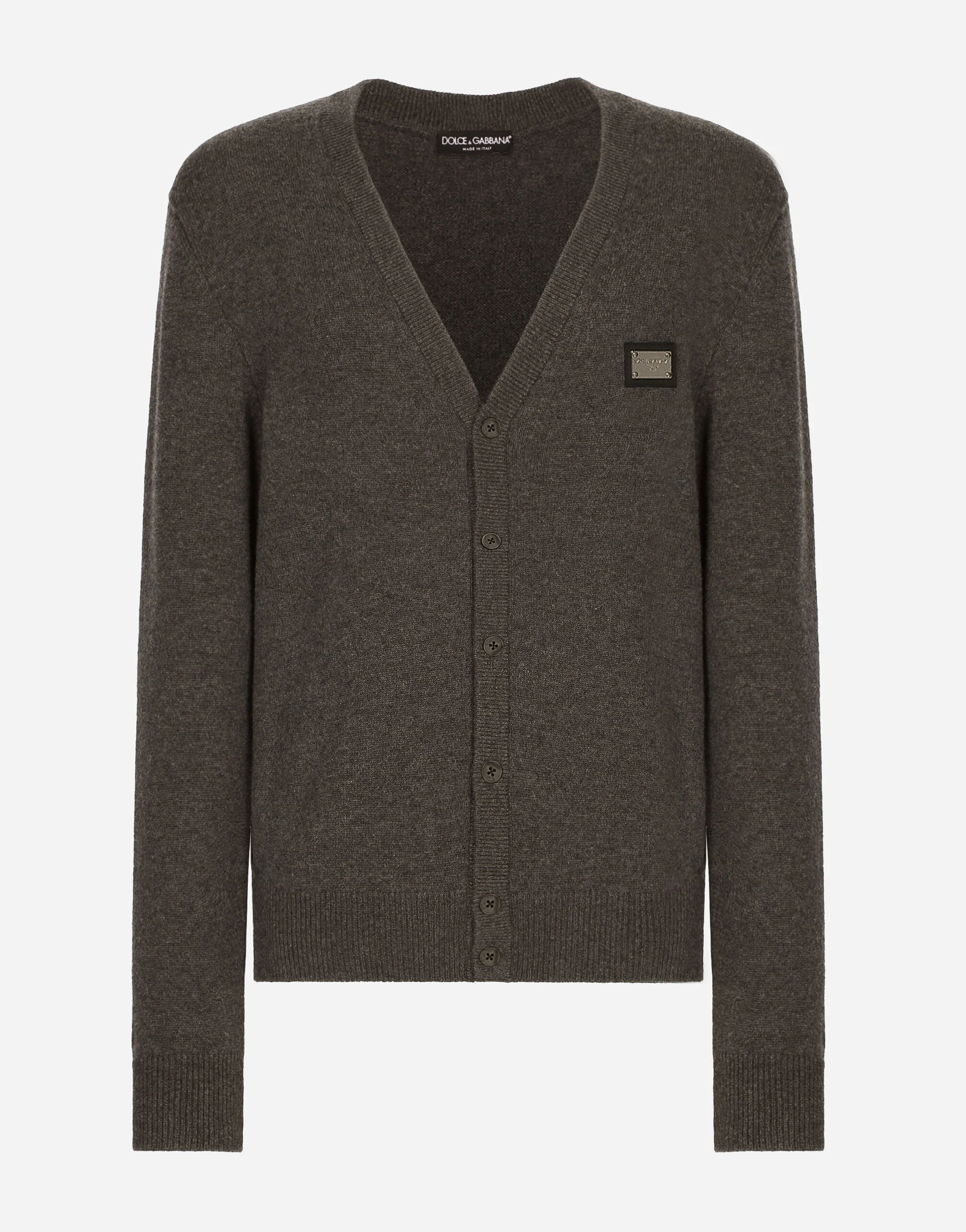 Wool and cashmere cardigan with metal tag featuring the Dolce&Gabbana logo: • Grey •Regular fit •V-neck •Button fastenings •8-gauge plain knit •The piece measures 69 cm from the rear collar seam on a size IT 48 •The model is 185 cm tall and wears a size IT 48 •Made in Italy Care And Details External composition: 90% Wool 10% Cashmere