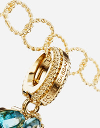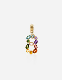 This charm features a pendant with 11 different gems in rainbow shades with various cuts and settings, connected to create the number 8. The DOLCE&GABBANA logo has been placed on the front of the closure, while on the back a hidden mechanism allows you to attach/detach the charm. Technical features: 18 Kt yellow gold Gems: 1 London Topaz: transparent, light blue color, oval shape 1 Swiss Topaz: transparent, light blue color, oval shape 1 amethyst (quartz variety): transparent, deep purple color, round shape 1 amethyst (quartz variety): transparent, purple color, oval shape 1 amethyst (quartz variety): transparent, pink color, rectangular shape with sharp edges removed 1 rhodolite garnet: transparent, orange-red color, oval shape 1 Madera Quartz: transparent, orange color, oval shape 1 citrine (quartz variety): transparent, deep yellow color, round shape 1 citrine (quartz variety): transparent, yellow color, square cushion shape 1 tourmaline: transparent, green color, round shape 1 peridot: transparent, yellowish green color, pear shape Made in Italy Yellow gold 750/000