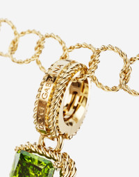The charm is illuminated by beautiful natural gems, such as topazes, garnets, amethysts, citrines, peridots, tourmalines, and beryls: the countless shades of their colors, dominated by blue, green, purple, red, pink, and yellow, evoke the warm and sunny atmospheres of Sicily. The different shapes and various cuts of the crystals are also emphasized by the settings, which alternate twisted wire work and smooth surfaces. Light reflects and refracts on the facets of the gems and the gold in a always surprising way, maximizing the brilliance of the charms. Technical features: Gold 750/000. Gems: 1 purple cushion-cut amethyst, 1 pink drop-shaped tourmaline, 1 orange-red oval cabochon garnet, 1 rectangular yellow citrine with truncated corners, 1 square green peridot with truncated corners, 1 square blue "Swiss" topaz with truncated corners. Made in Italy. Complete the look with the twisted wire chain in yellow gold and create your favorite word. For a better fit, we recommend a distance of 5 empty rings between the pendants. Yellow 18 kt Gold