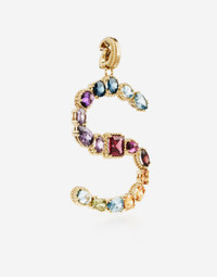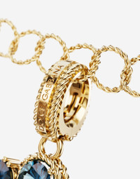 The charm is illuminated by beautiful natural gems, such as topazes, garnets, amethysts, citrines, peridots, tourmalines, and beryls: the countless shades of their colors, dominated by blue, green, purple, red, pink, and yellow, evoke the warm and sunny atmospheres of Sicily. The different shapes and various cuts of the crystals are also emphasized by the settings, which alternate twisted wire work and smooth surfaces. Light reflects and refracts on the facets of the gems and the gold in a always surprising way, maximizing the brilliance of the charms. Technical features: Gold 750/000. Gems: 1 intense purple amethyst oval cabochon, 1 oval purple amethyst, 1 light purple amethyst pear, 1 very light purple oval amethyst, 1 square pink quartz with rounded corners, 1 oval reddish-violet rhodolite garnet cabochon, 1 oval reddish-orange spessartine garnet, 1 oval "Madera" quartz, 1 intense yellow oval citrine, 1 round yellow citrine, 1 blue/green tourmaline pear, 1 oval green peridot, 1 oval green quartz cabochon, 1 "Sky" blue pear-shaped topaz, 2 oval and round "Swiss" blue topazes, 1 round "London" blue topaz. Made in Italy. Complete the look with the twisted wire chain in yellow gold and create your favorite word. For a better fit, we recommend a distance of 5 empty rings between the pendants. Yellow 18 kt Gold