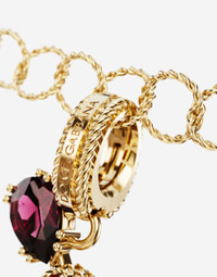 The charm is illuminated by beautiful natural gems, such as topazes, garnets, amethysts, citrines, peridots, tourmalines, and beryls: the countless shades of their colors, dominated by blue, green, purple, red, pink, and yellow, evoke the warm and sunny atmospheres of Sicily. The different shapes and various cuts of the crystals are also emphasized by the settings, which alternate twisted wire work and smooth surfaces. Light reflects and refracts on the facets of the gems and the gold in a always surprising way, maximizing the brilliance of the charms. Technical features: Gold 750/000. Gems: 1 intense round purple amethyst, 1 square purple amethyst with truncated corners, 1 light round purple amethyst, 1 oval pink tourmaline, 1 drop red-violet rhodolite garnet, 1 oval orange-red spessartine garnet, 1 "Madera" cushion quartz, 1 intense yellow oval citrine, 1 oval cabochon yellow citrine, 1 light round yellow citrine, 1 oval cabochon blue/green tourmaline, 1 oval green peridot, 1 "Sky" blue cushion topaz, 1 rectangular truncated corner "London" blue topaz. Made in Italy. Complete the look with the twisted wire chain in yellow gold and create your favorite word. For a better fit, we recommend a distance of 5 empty rings between the pendants. Yellow 18 kt Gold
