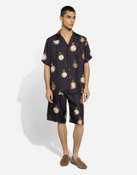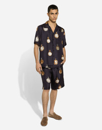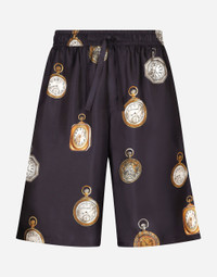 Tailoring means beauty, proportions, skilled cuts and sophisticated details. The FW 24-25 Sartoriale Collection builds on this solid foundation to define new ways of pairing colors, materials and textures. Sicilian rock gray envelops different textures, while Nero Sicilia black adorns textile and velvet weaves and camel pairs with orange. Various types of pinstripes, textured-effect cashmere, double fabrics, suede and denim meet in the looks. Watch-print silk twill jogging shorts: • Blue • Regular fit • Stretch waistband with drawstring • Front slant pockets and buttoned patch pocket at the back • Side slits • The item measures 58 cm on the outer leg and the hem is 32 cm wide on a size IT 48 • Made in Italy The difference in the print placement that you may find on this product is a feature of Dolce&Gabbana’s “Handmade” pieces. A detail that makes every garment or accessory unique and exclusive. External composition: 100% Silk