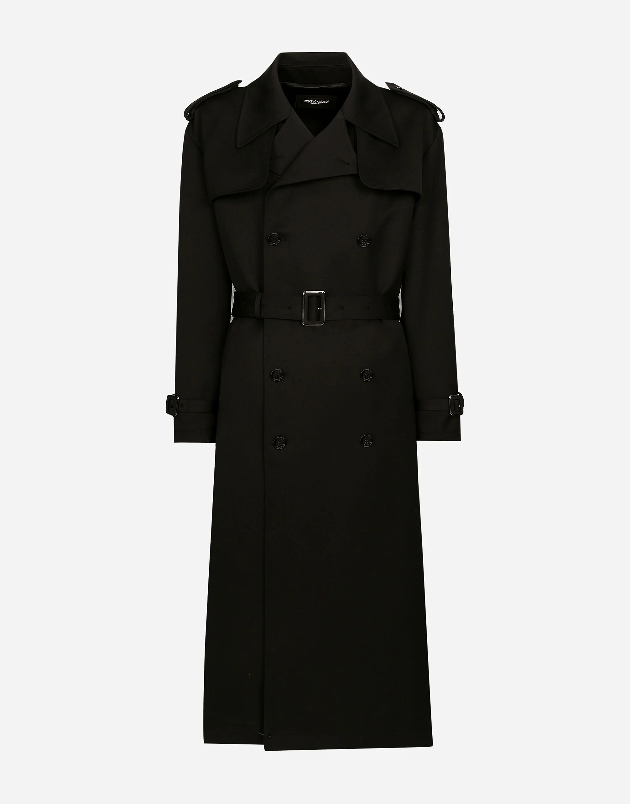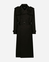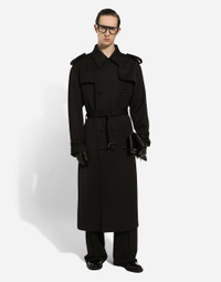 Contemporary men’s formalwear: The FW 24/25 Dolce&Gabbana Men’s Collection is embracing the concept of absolute elegance dominated by the iconic Nero Sicilia black. The daywear of the Dolce&Gabbana man comes to life through the outerwear that comes in a range of lengths and the slim-fit pants. For nightwear, the look becomes scintillating thanks to sequined embellishment and stone appliques. This refined taste can also be seen on the accessories, such as on the slip-ons with hand-applied organza flower accent and the new clutch. Double-breasted wool gabardine trench coat with shoulder flaps on the front and epaulets on the shoulders: • Black • Regular fit • Button fastenings • Lined •Waist belt and straps on the cuffs with branded buckles • Deep vent on the back with inner button • The piece measures 130 cm from the rear collar seam on a size IT 48 • Made in Italy External composition: 95% Virgin Wool 3% Cotton 2% Spandex Internal Composition: 100% Silk