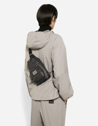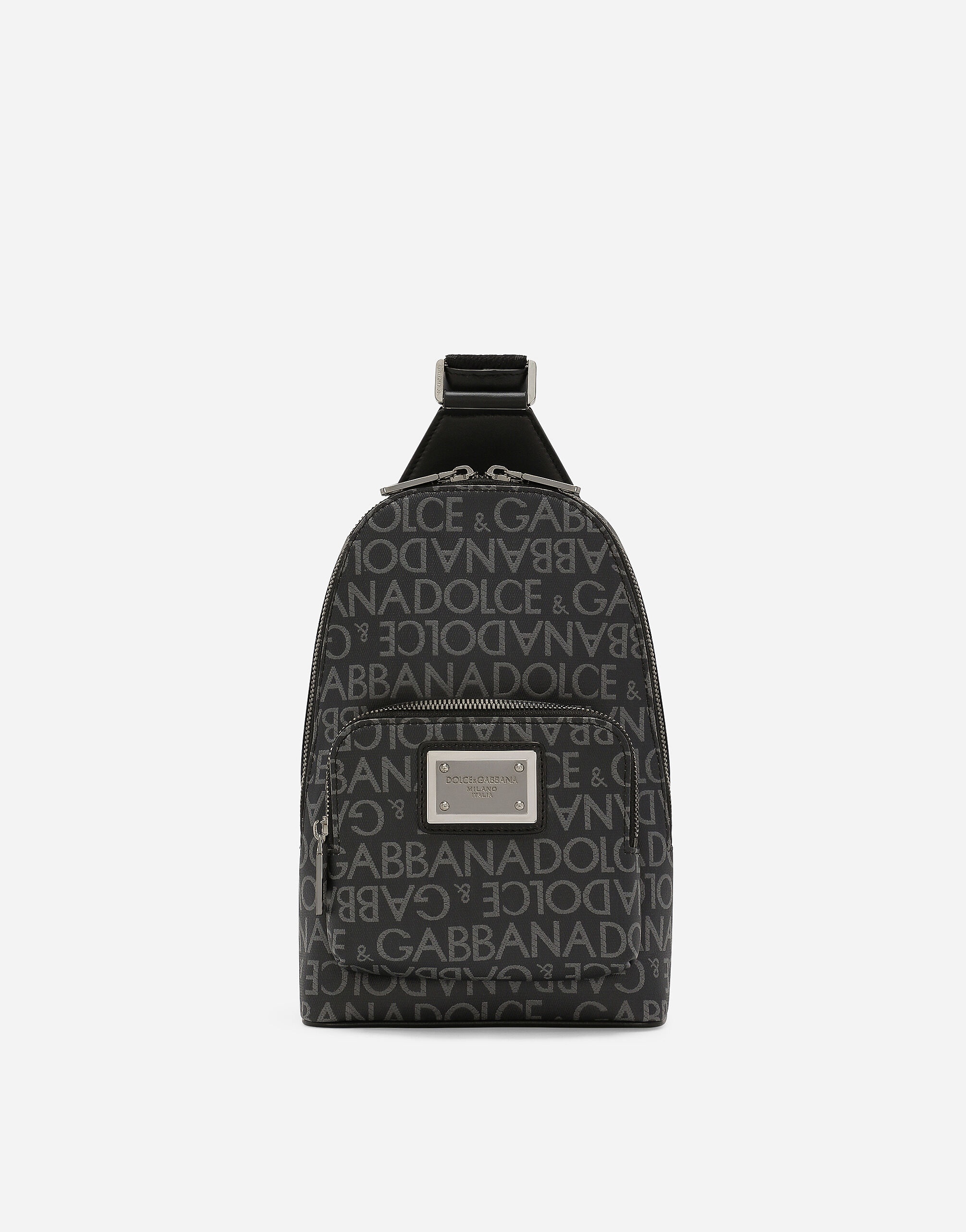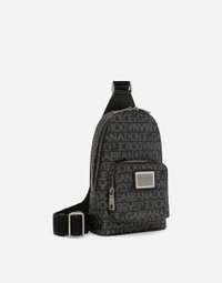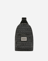 Practical and versatile, this new coated fabric crossbody backpack features the all-over jacquard Dolce&Gabbana logo. Coated jacquard crossbody backpack with the all-over jacquard Dolce&Gabbana logo: • Black • Branded tag in ruthenium-electroplated metal • Top fastening with double zipper and slider with logo • Back pocket and front pocket with zipper and branded sliders • Adjustable tape strap with calfskin details • Fabric lining and zipped pocket • Item comes with a branded dust bag • Measurements: H25 x W16.5 x D8 cm • Made in Italy External composition: 40% Cotton 20% Polyurethane 20% Calfskin 15% Polyester 5% Viscose Internal composition: 80% Cotton 10% Calfskin 10% Acrylic