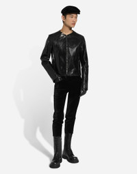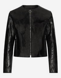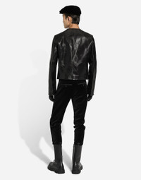 Contemporary men’s formalwear: The FW 24/25 Dolce&Gabbana Men’s Collection is embracing the concept of absolute elegance dominated by the iconic Nero Sicilia black. The daywear of the Dolce&Gabbana man comes to life through the outerwear that comes in a range of lengths and the slim-fit pants. For nightwear, the look becomes scintillating thanks to sequined embellishment and stone appliques. This refined taste can also be seen on the accessories, such as on the slip-ons with hand-applied organza flower accent and the new clutch. Collarless calfskin jacket with a raw cut: • Black • Regular fit • Front zipper fastening • Outer patch pockets with exposed zippers and inner welt pockets • Lined • The piece measures 60 cm from the rear collar seam on a size IT 48 • Made in Italy External composition: 50% Calfskin 45% Polyester 5% Spandex Internal Composition: 100% Viscose