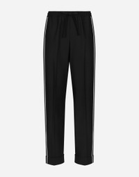 Contemporary men’s formalwear: The FW 24/25 Dolce&Gabbana Men’s Collection is embracing the concept of absolute elegance dominated by the iconic Nero Sicilia black. The daywear of the Dolce&Gabbana man comes to life through the outerwear that comes in a range of lengths and the slim-fit pants. For nightwear, the look becomes scintillating thanks to sequined embellishment and stone appliques. This refined taste can also be seen on the accessories, such as on the slip-ons with hand-applied organza flower accent and the new clutch. Wool pajama pants with piping: • Black • Regular fit • Stretch waistband with drawstring • Front slant pockets and welt back pocket • The item measures 115 cm on the outer leg and the hem is 25 cm wide on a size IT 48 • Made in Italy External composition: 100% Virgin Wool