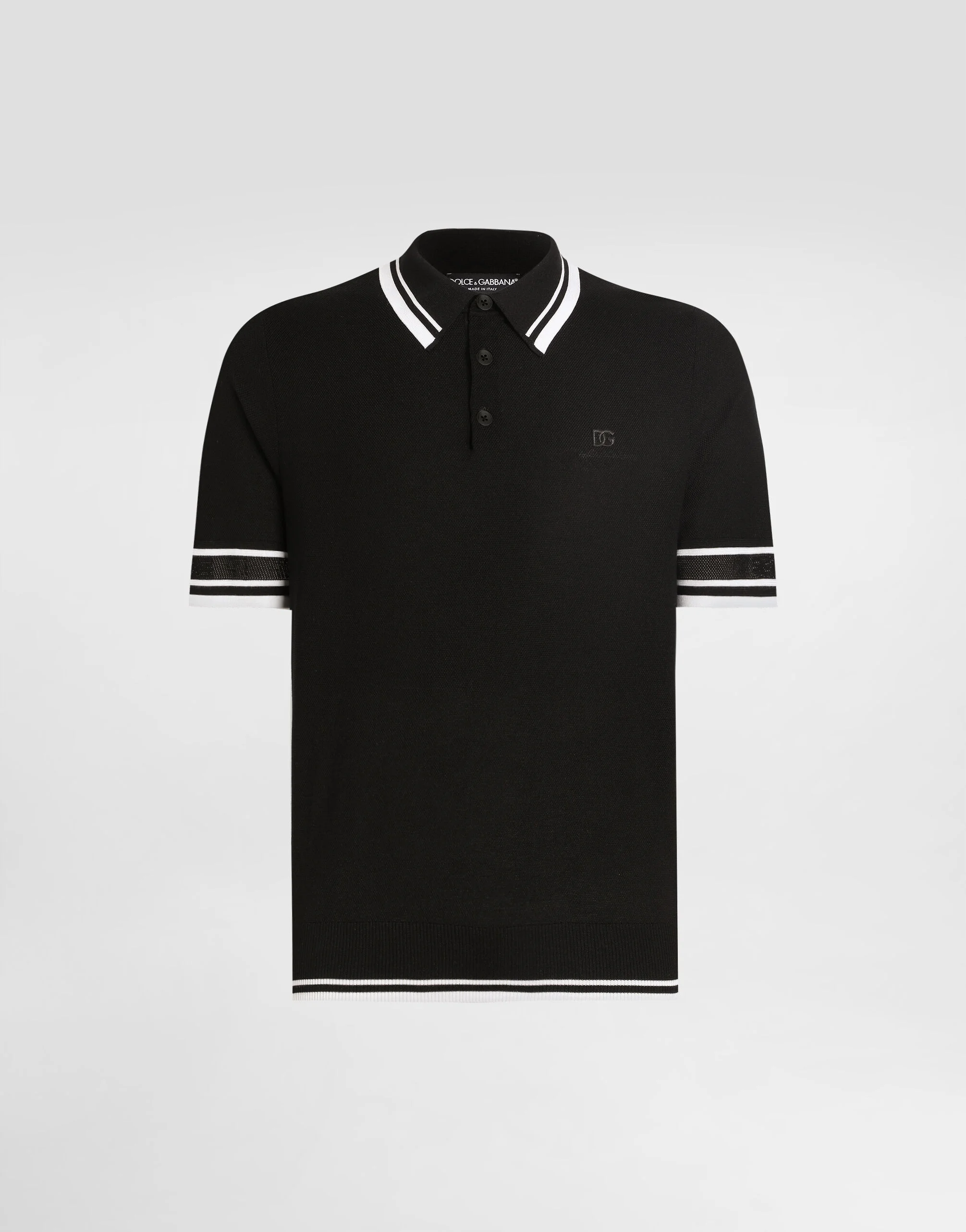 This elegant pullover is perfect for any occasion, thanks to its high-quality workmanship and sophisticated design. Silk pique polo shirt: • Black • Polo-shirt collar • Short sleeves • Bottom width 66 cm on size 48 IT • The model is 185 cm tall and wears a size 48 IT • Made in Italy External Composition: 97% Silk, 3% Polyamide