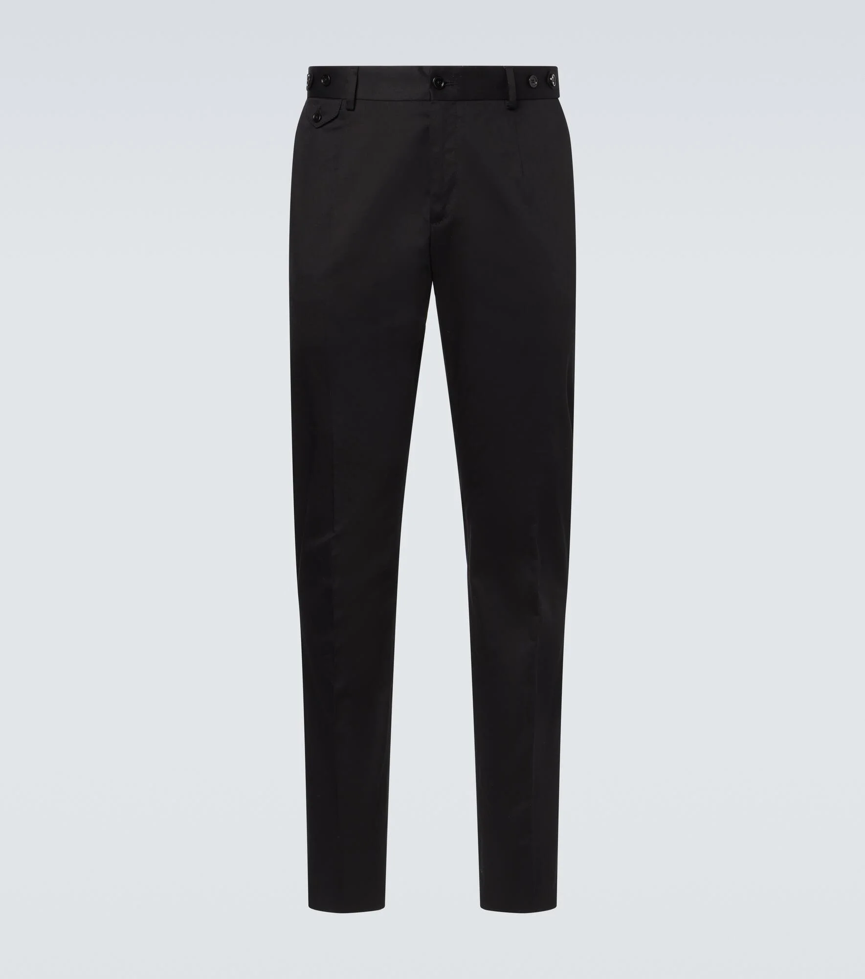 Sicilian culture is at the heart of Dolce&Gabbana's aesthetic, which attributes most of its bold styles to its Italian heritage. These pants are crafted from a soft cotton blend and feature a slim silhouette with adjustable tabs at the waist. Product Details - Material: 97% cotton, 3% elastane - Care instructions: dry clean - Made in Italy - Designer color name: Black - Item color: black - Hem: unfinished (ready for alteration) - Closure: zip and button fastening - Adjustable tabs at the waist - Pockets: slant pocket, flap pockets - Item number: P01129751 Size & Fit - True to size - Non-stretchy fabric - Slim-leg - Unhemmed for tailoring - Height of model is 189cm-74.5" and wears a size 50