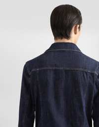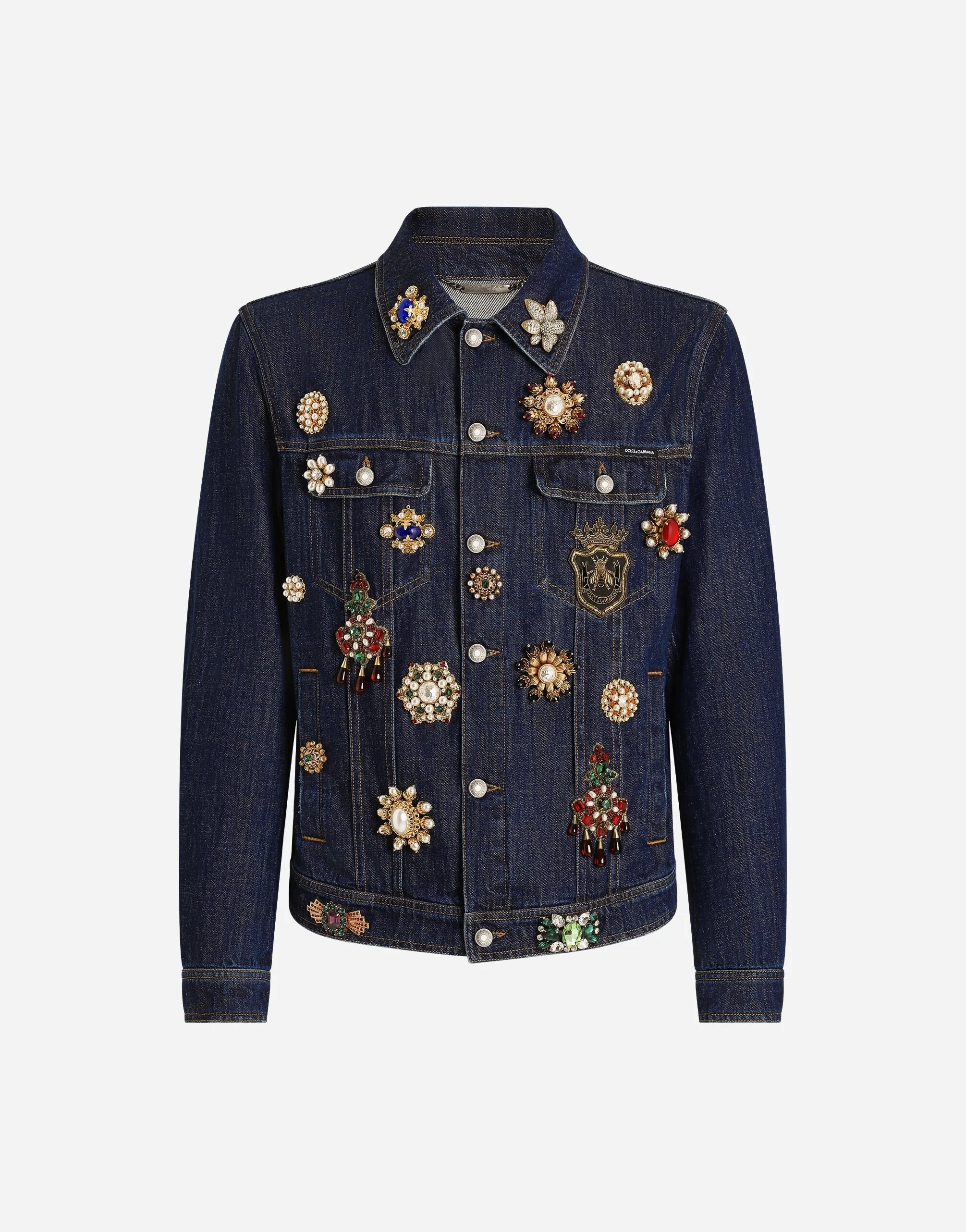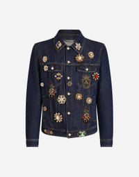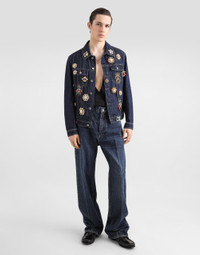 The Italian Holiday Men's Collection revisits 1950s style with a blend of relaxed fits and modern flair. Classic white shirts and tailored suits in refined fabrics contrast with casual denim and playful T-shirts featuring retro graphics with a futuristic twist. Bold prints—chessboards, cats, elegant lighters, and Mediterranean blue ribbons—alongside logo jacquard inspired by ties, infuse a contemporary edge into the essence of Italian holidays. Cotton denim jacket with bejeweled brooches: • Blue • Slim fit • Branded metal buttons on the front • Pockets with buttons and Dolce&Gabbana logo label • The piece measures 60 cm from the rear collar seam on a size IT 48 • Made in Italy External composition: 100% Cotton