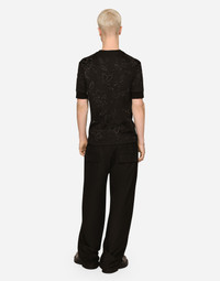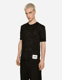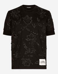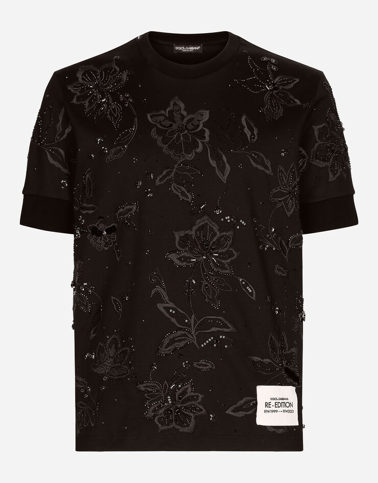 Cotton jersey interlock T-shirt with floral embroidery, sequin and rhinestone embellishment and the Re-Edition label: • Black • Slim fit • Stretch knit round neck • Short sleeves • The piece measures 70 cm from the rear collar seam on a size IT 48 • The model is 185 cm tall and wears a size IT 48 • Made in Italy Care And Details External composition: 100% Cotton