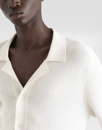 Italy and its beauty are reflected in the Men’s SS25 Collection. Woven raffia and leather give life to jackets, polo-shirts and sweaters to celebrating Italian craftsmanship. The color palette ranges from Nero Sicilia black to burgundy, contributing to conveying a sense of eternal elegance. Refined accessories complement the look: belts and loafers with hand-finished details and oversize bags, such as the Sicily, the Marlene with crocodile-effect print and the versatile Adamo tote. Cotton openwork-knit shirt: • White • Slim fit • Hawaiian collar • Long sleeves • Button fastenings • 14-gauge knit • The piece measures 67 cm from the shoulder seam on a size IT 48 • Made in Italy External composition: 100% Cotton