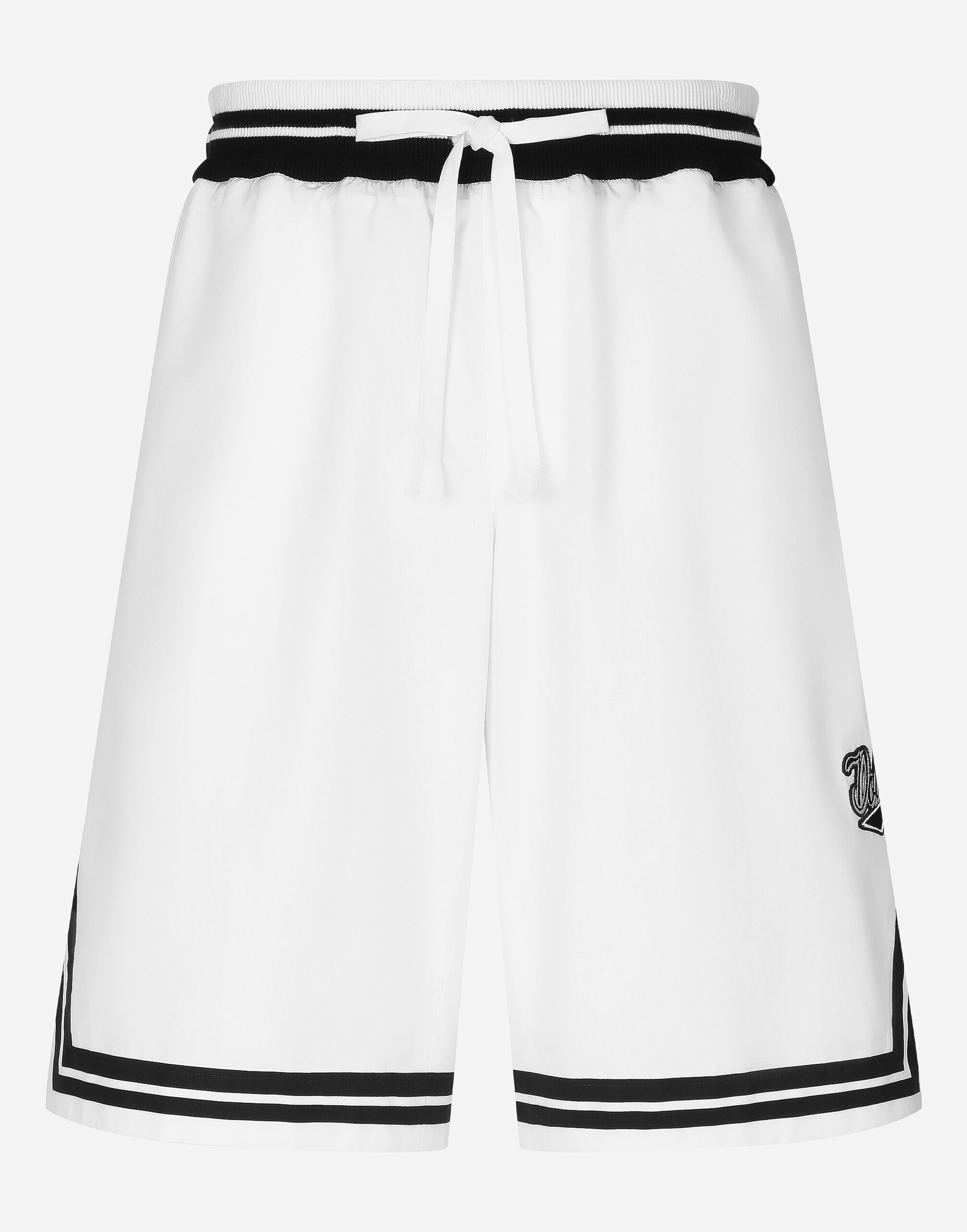 Cotton shorts with Dolce&Gabbana logo embroidery: • White • Contrasting black stripes • Regular fit • Stretch waistband with drawstring • Front slant pockets and patch back pocket • The item measures 58 cm on the outer leg and the hem is 32 cm wide on a size IT 48 • Made in Italy Cotton shorts with Dolce&Gabbana logo embroidery: • White • Contrasting black stripes • Regular fit • Stretch waistband with drawstring • Front slant pockets and patch back pocket • The item measures 58 cm on the outer leg and the hem is 32 cm wide on a size IT 48 • Made in Italy External composition: 100% Cotton
