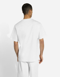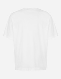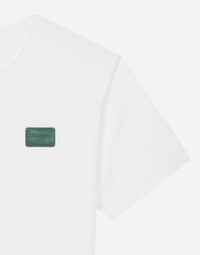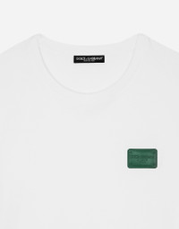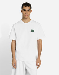 Pictorial, at times volumetric with a textured effect, the decorative “calligraphic-naturalistic” majolica in solid-color green gives life to a collection distinguished by eclectic silhouettes, some stolen from the world of sports, with a cool and light vibe. The vibrant two-tone accenting – green and white – is designed to enhance a series of details, such as the pockets, the green piping paired with the white silk pajamas, the stripes on the polo-shirts, the cuffs on the shirts or the jersey inserts on the T-shirts. Cotton jersey T-shirt with Dolce&Gabbana logo tag: • White • Regular fit • Stretch knit round neck • Short sleeves • The piece measures 73 cm from the rear collar seam on a size IT 48 • Made in Italy External composition: 100% Cotton