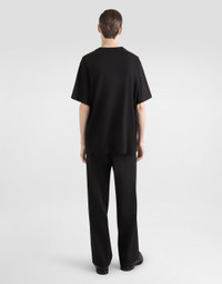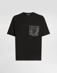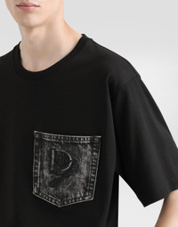 The Italian Holiday Men's Collection revisits 1950s style with a blend of relaxed fits and modern flair. Classic white shirts and tailored suits in refined fabrics contrast with casual denim and playful T-shirts featuring retro graphics with a futuristic twist. Bold prints—chessboards, cats, elegant lighters, and Mediterranean blue ribbons—alongside logo jacquard inspired by ties, infuse a contemporary edge into the essence of Italian holidays. Cotton jersey T-shirt with denim pocket and DG logo embroidery: • Black • Regular fit • Short sleeves • The piece measures 73 cm from the shoulder seam on a size IT 48 • Made in Italy External composition: 100% Cotton