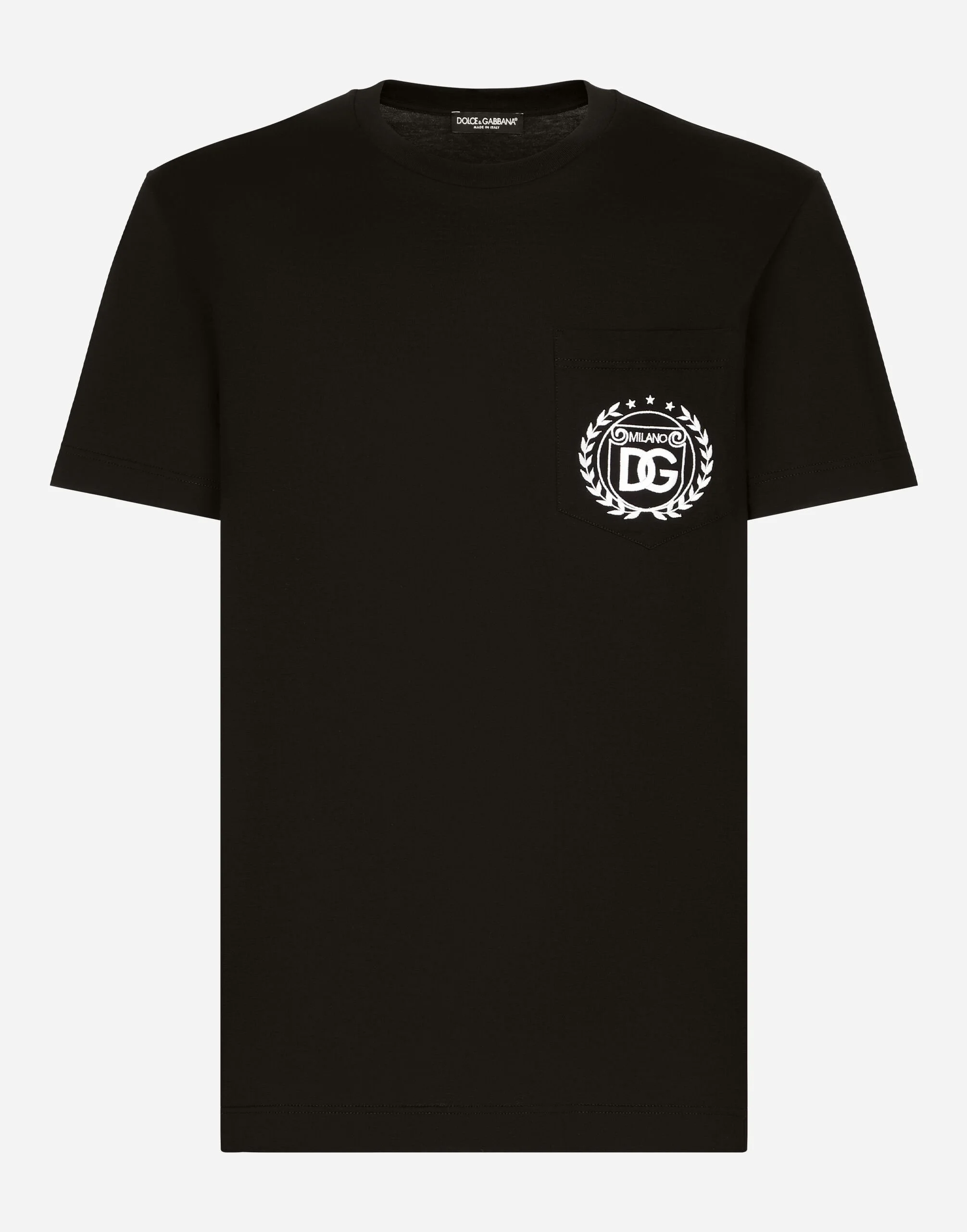 Cotton jersey T-shirt with DG Milano logo and laurel embroidery: • Black • Classic fit • Stretch knit round neck • Short sleeves • The piece measures 71.5 cm from the rear collar seam on a size IT 48 • The model is 185 cm tall and wears a size IT 48 • Made in Italy Care And Details External composition: 100% Cotton