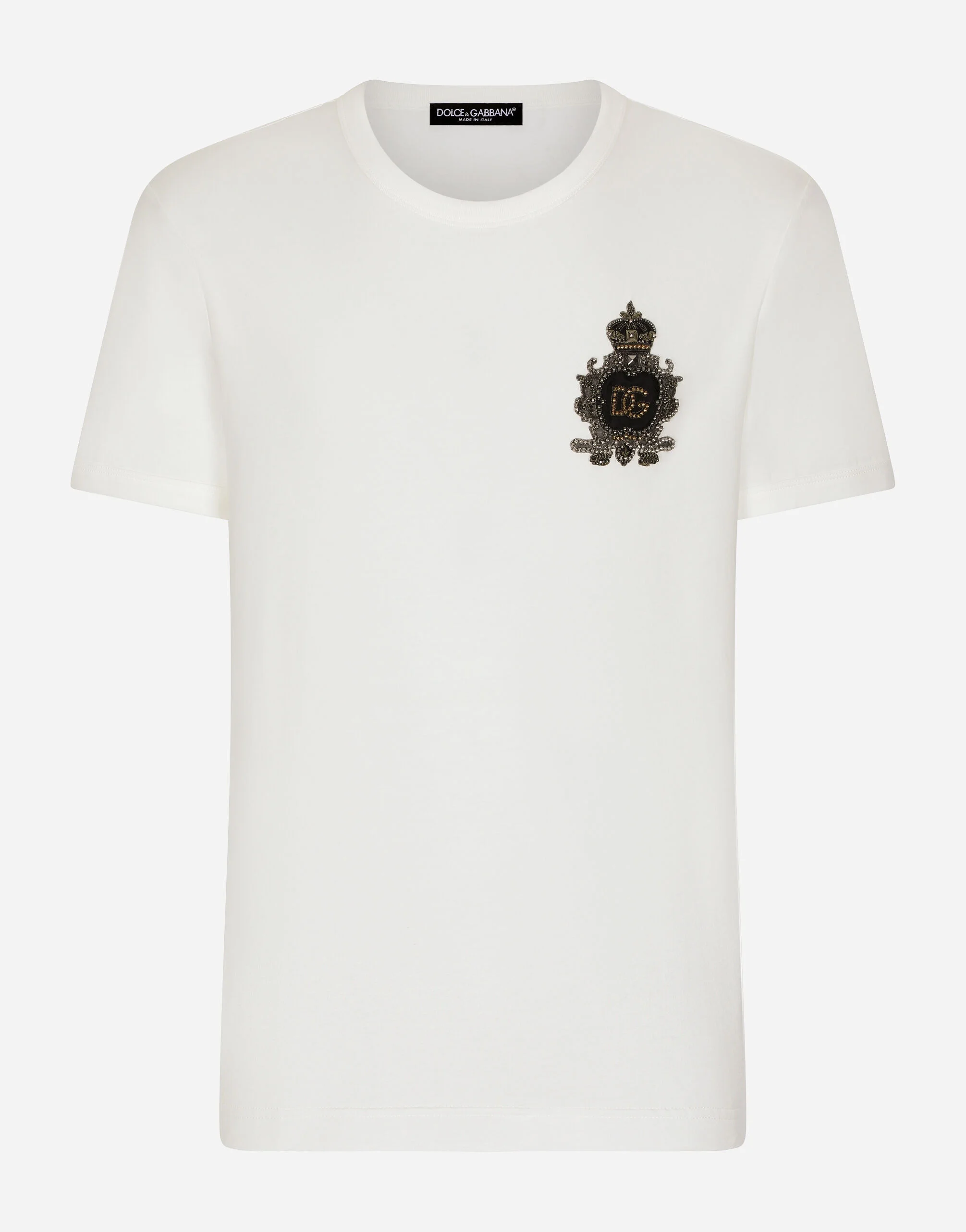 Cotton jersey T-shirt with heraldic DG logo patch: • White • Classic fit • Round neck • Short sleeves • The piece measures 72 cm from the rear collar seam on a size IT 48 • The model is 185 cm tall and wears a size IT 48 • Made in Italy Care And Details External composition: 100% Cotton