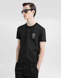 The Italian Holiday Men's Collection revisits 1950s style with a blend of relaxed fits and modern flair. Classic white shirts and tailored suits in refined fabrics contrast with casual denim and playful T-shirts featuring retro graphics with a futuristic twist. Bold prints—chessboards, cats, elegant lighters, and Mediterranean blue ribbons—alongside logo jacquard inspired by ties, infuse a contemporary edge into the essence of Italian holidays. Cotton jersey T-shirt with heraldic emblem patch: • Black • Classic fit • Branded stick label on the neck • Knit neck, sleeves and hem • Short sleeves • The piece measures 72 cm from the shoulder seam on a size IT 48 • Made in Italy External composition: 100% Cotton