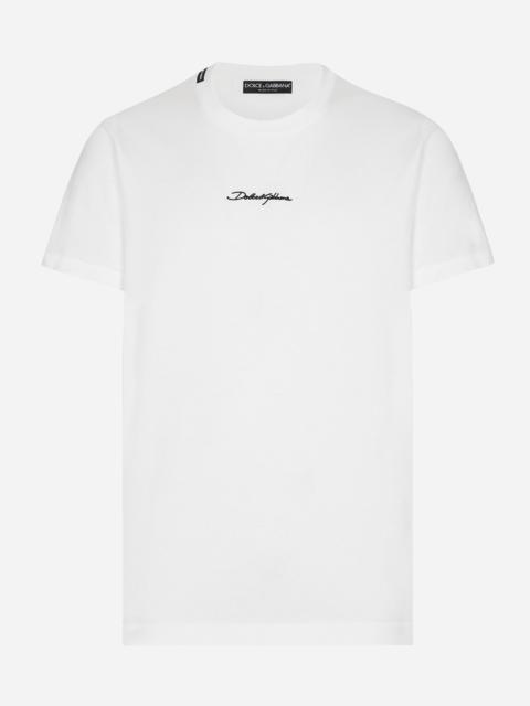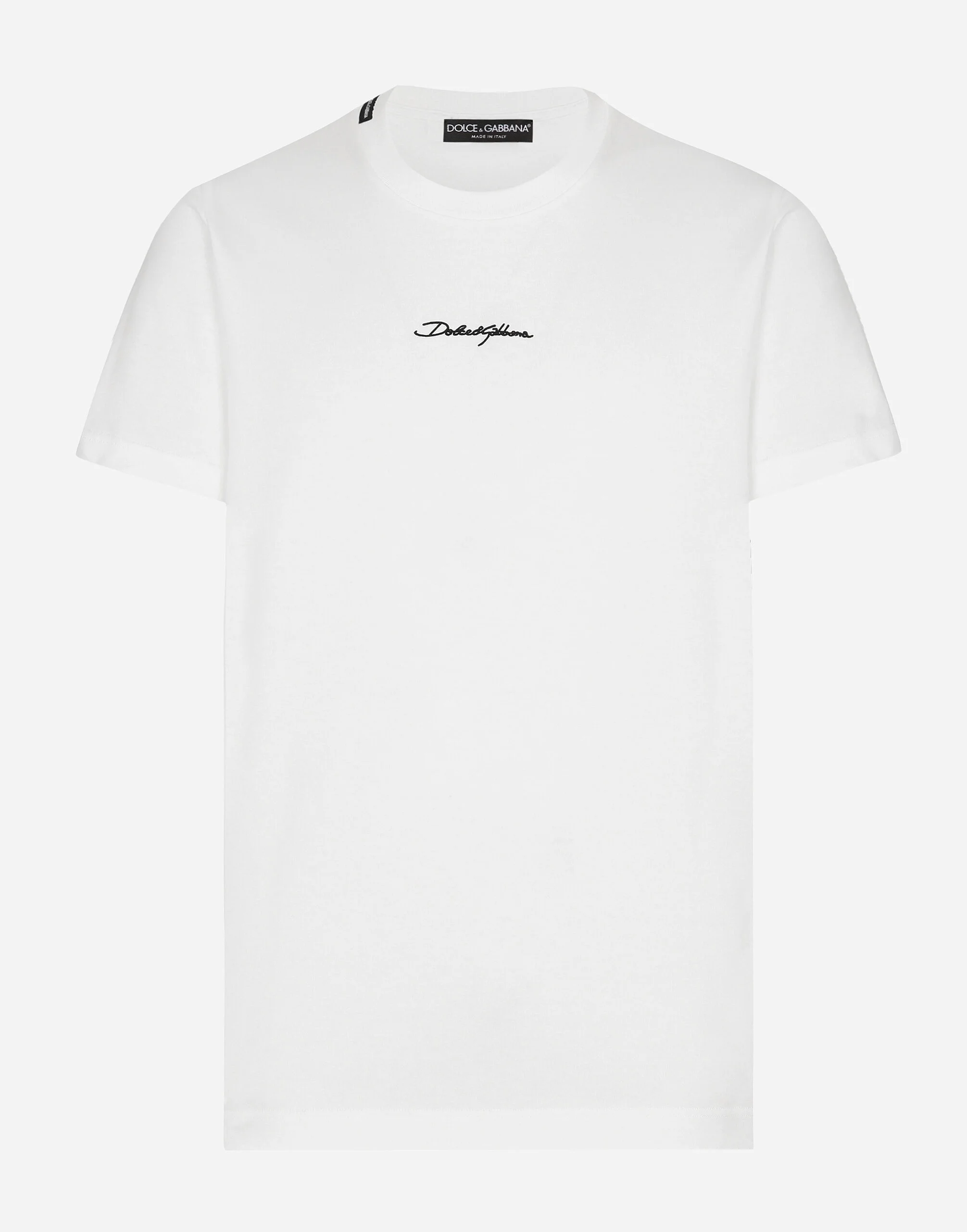 The Palermo collection represents the link between the Sicilian man’s world and the unspoiled nature of the island. A language marked by warm hues – sand, cream, Nero Sicilia black – floral paintings and iconic prints. The Dolce&Gabbana closet must-haves have been reworked in different materials, in pursuit of a new form of harmony. A collection rich in suggestion, such as the stripes inspired by the old mattresses of the 1940s and 1950s, and the timeless aesthetic of the looks. Cotton jersey T-shirt with Dolce&Gabbana logo patch: • White • Regular fit • Stretch knit round neck • Short sleeves • The piece measures 71.5 cm from the rear collar seam on a size IT 48 • Made in Italy External composition: 100% Cotton