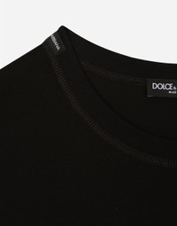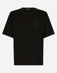 Tailoring means beauty, proportions, skilled cuts and sophisticated details. The FW 24-25 Sartoriale Collection builds on this solid foundation to define new ways of pairing colors, materials and textures. Sicilian rock gray envelops different textures, while Nero Sicilia black adorns textile and velvet weaves and camel pairs with orange. Various types of pinstripes, textured-effect cashmere, double fabrics, suede and denim meet in the looks. Cotton jersey T-shirt with heraldic DG logo embroidery: • Black • Regular fit • Stretch knit round neck • Short sleeves • The piece measures 73 cm from the rear collar seam on a size IT 48 • Made in Italy External composition: 100% Cotton Internal composition: