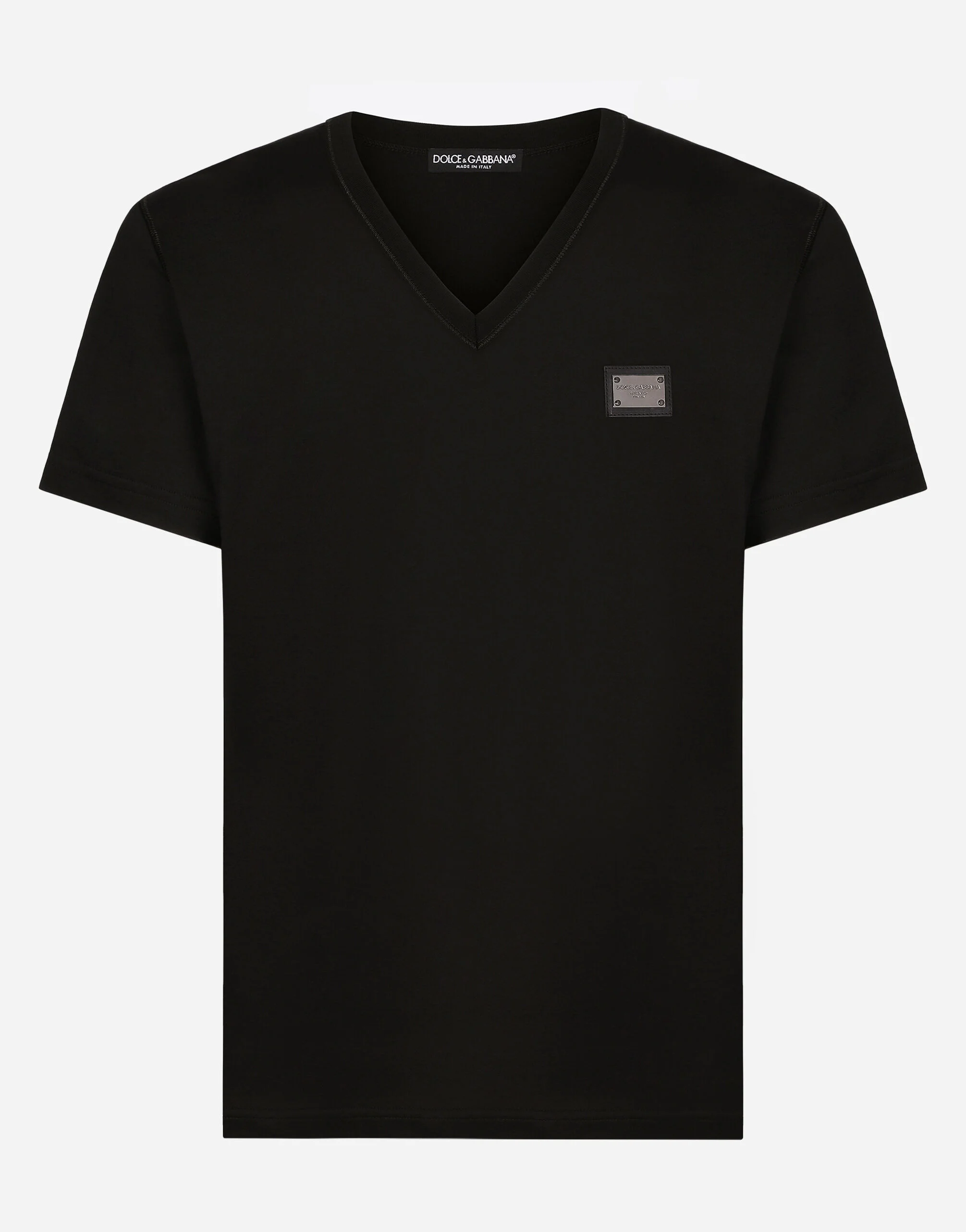 Cotton jersey T-shirt with metal tag featuring the Dolce&Gabbana logo: • Regular fit • V-neck • Short sleeves • The piece measures 73 cm from the rear collar seam on a size IT 48 • The model is 185 cm tall and wears a size IT 48 • Made in Italy Care And Details External composition: 100% Cotton
