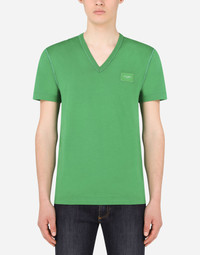 Cotton V-neck T-shirt with branded plate