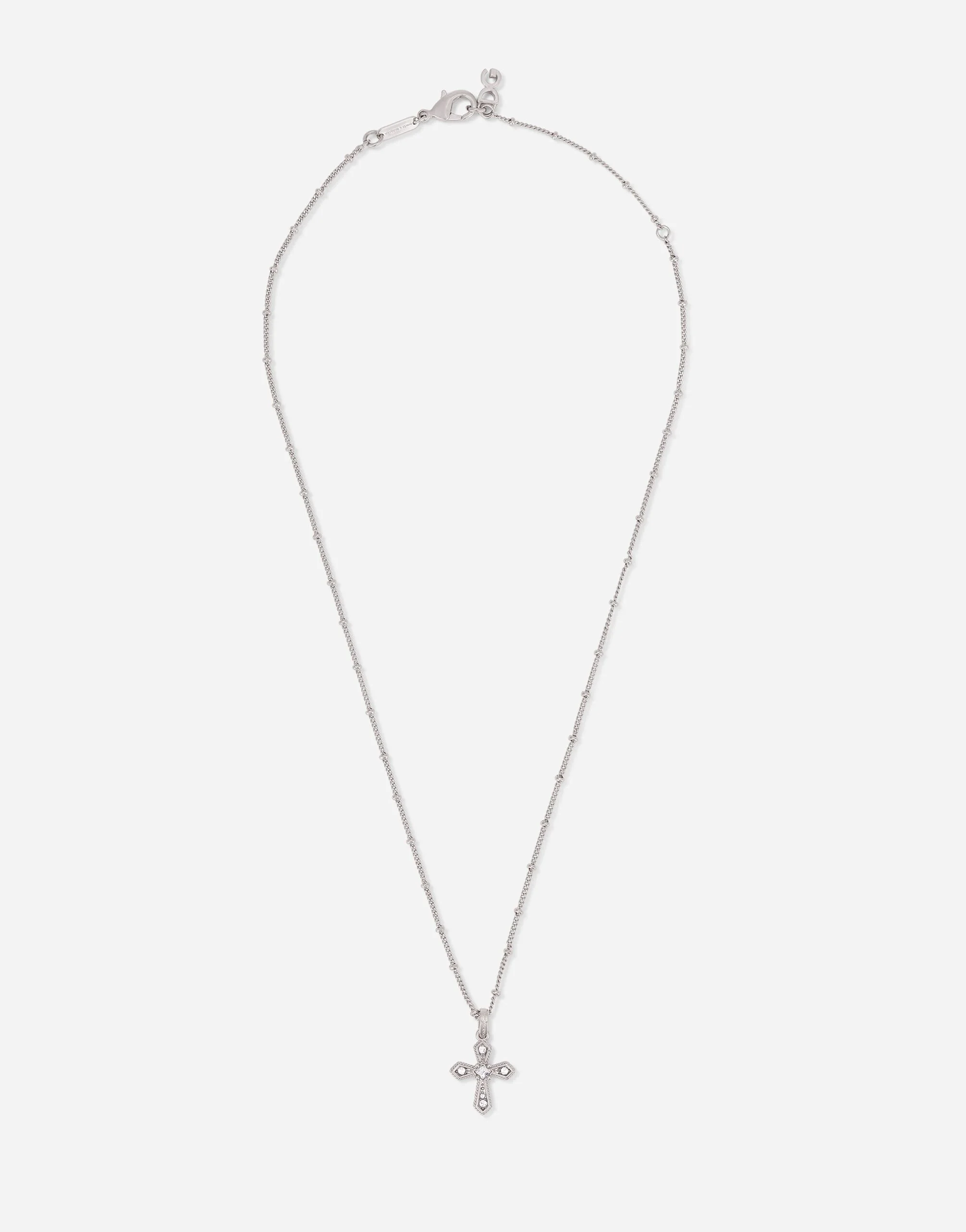 The Dolce&Gabbana Jewelery collection has the right detail for giving your look some elegance and sophistication. Silver-plated necklace: • Crystal-adorned cross pendant • Clasp fastening with DG logo pendant • Nickel-free and hypoallergenic materials • Sizes available: S/M/L • Made in Italy Care And Details Composition: 95% Nickel-free Brass 5% Glass