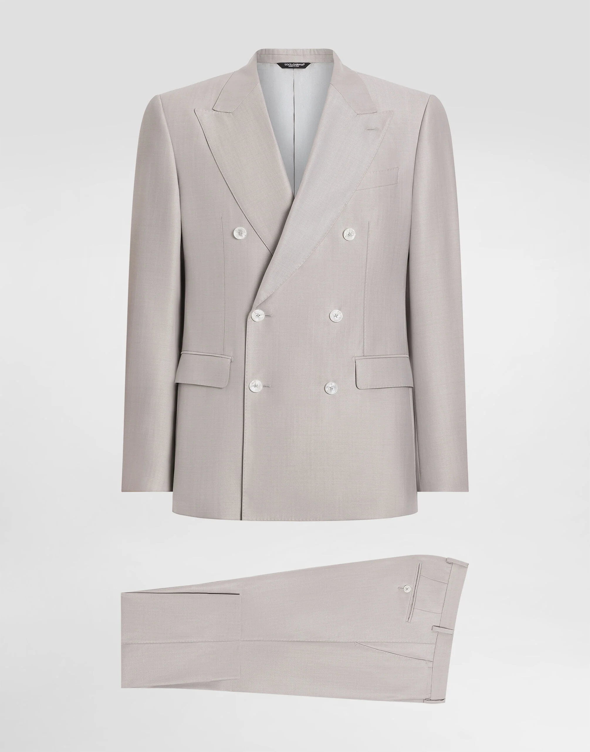 The Italian Holiday Men's Collection revisits 1950s style with a blend of relaxed fits and modern flair. Classic white shirts and tailored suits in refined fabrics contrast with casual denim and playful T-shirts featuring retro graphics with a futuristic twist. Bold prints—chessboards, cats, elegant lighters, and Mediterranean blue ribbons—alongside logo jacquard inspired by ties, infuse a contemporary edge into the essence of Italian holidays. Tailored wool and silk two-piece suit with bee and crown emblem: • Pink • Regular fit • Deconstructed light Sicilia-fit jacket with peak lapels, flap pockets and breast pocket, inner pockets and central vent • Double-breasted fastening with five buttons • Lined • Pants with front slant pockets and rear buttoned welt pockets • The jacket measures 70 cm from the back collar seam on a size IT 48 • The pants measure 105.5 cm on the outer leg and the hem is 18 cm wide on a size IT 48 • Made in Italy External composition: 18% Silk 82% Virgin wool Internal composition: 80% Silk 20% Viscose